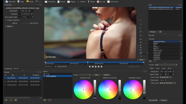 Multiple dockable and undockable panels, including detailed media properties, recent files with search, playlist with thumbnail view, filter panel, history view, encoding panel, jobs queue, and melted server and playlist. Also supports drag-n-drop of assets from file manager.